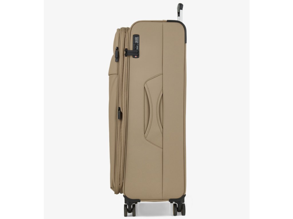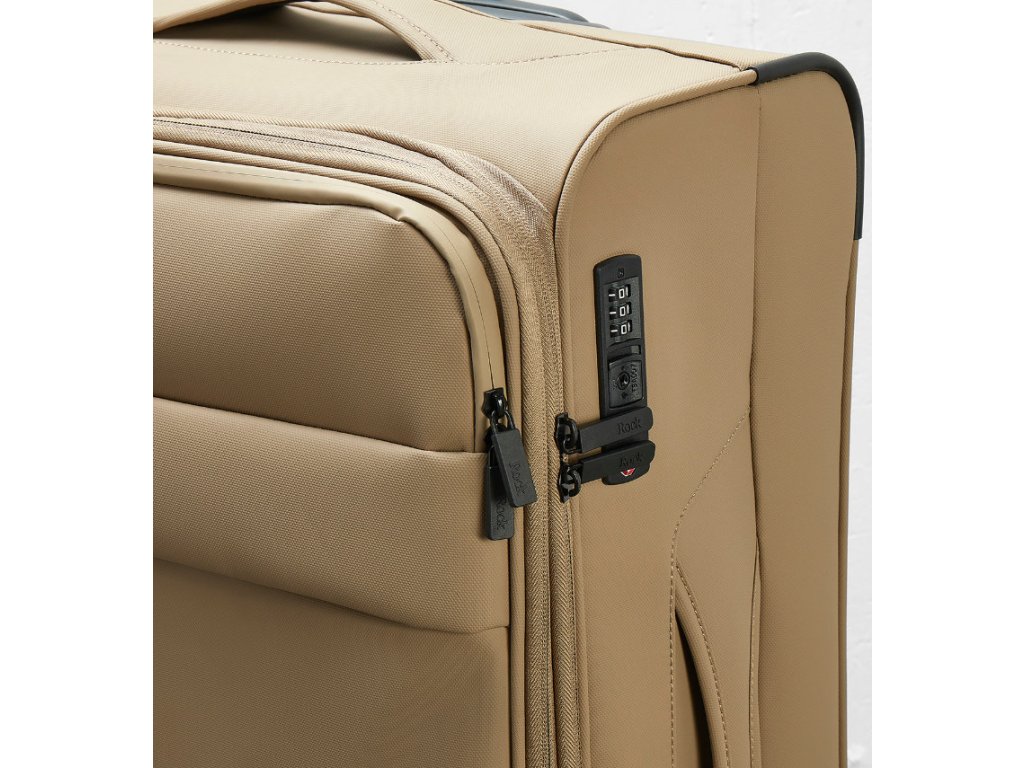 U kufru lze pomocí druhého zipu zvětšit vnitřní objem. V přední části jsou umístěny dvě menší kapsy uzavíratelné zipem. Horní i boční madlo je polstrované v barvě kufru. Celý pojízdný systém je umístěn uvnitř kufru pod textilní podšívkou, aby nedošlo k poškození systému při přepravě, a je opatřen čtyřmi dvojitými kolečky otočnými o 360°. Na vnitřní straně víka je kapsa na zip.