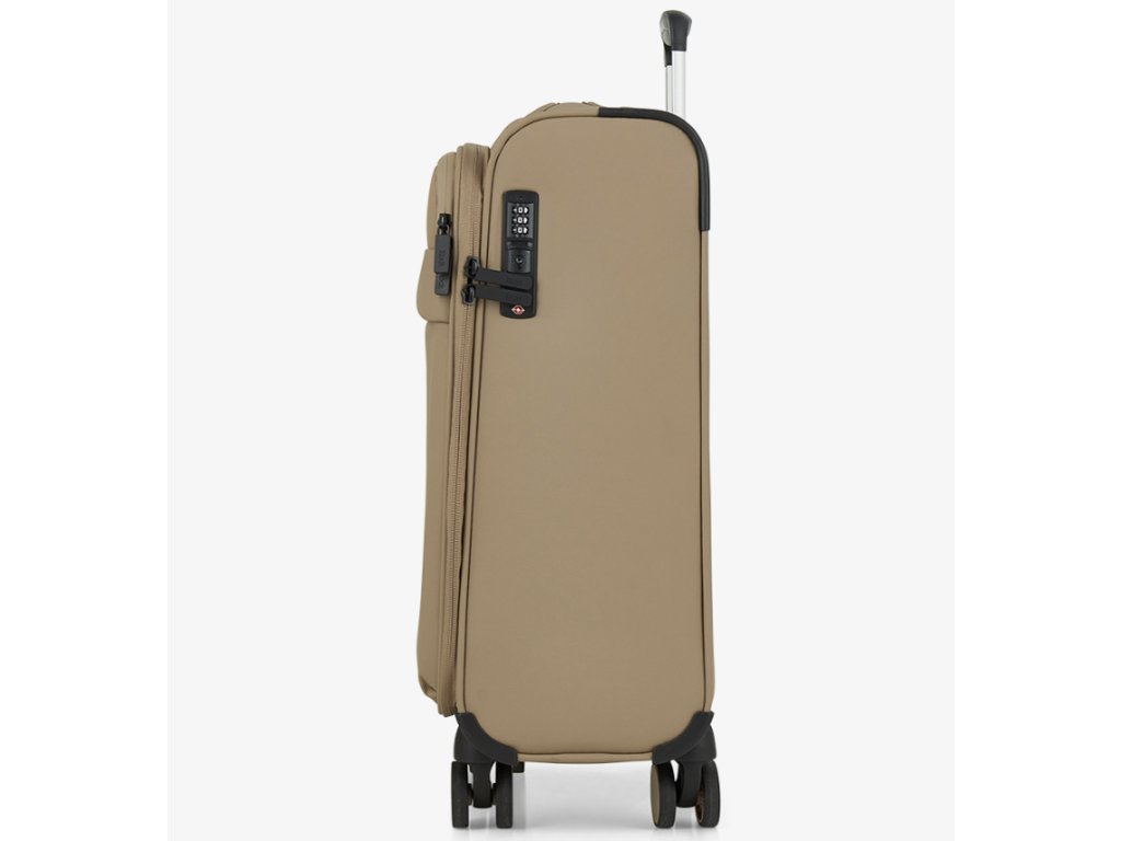 V přední části jsou umístěny dvě menší kapsy uzavíratelné zipem. Horní madlo je polstrované v barvě kufru. Tato velikost kufru nemá boční madlo. Celý pojízdný systém je umístěn uvnitř kufru pod textilní podšívkou, aby nedošlo k poškození systému při přepravě, a je opatřen čtyřmi dvojitými kolečky otočnými o 360°. Na vnitřní straně víka je kapsa na zip.